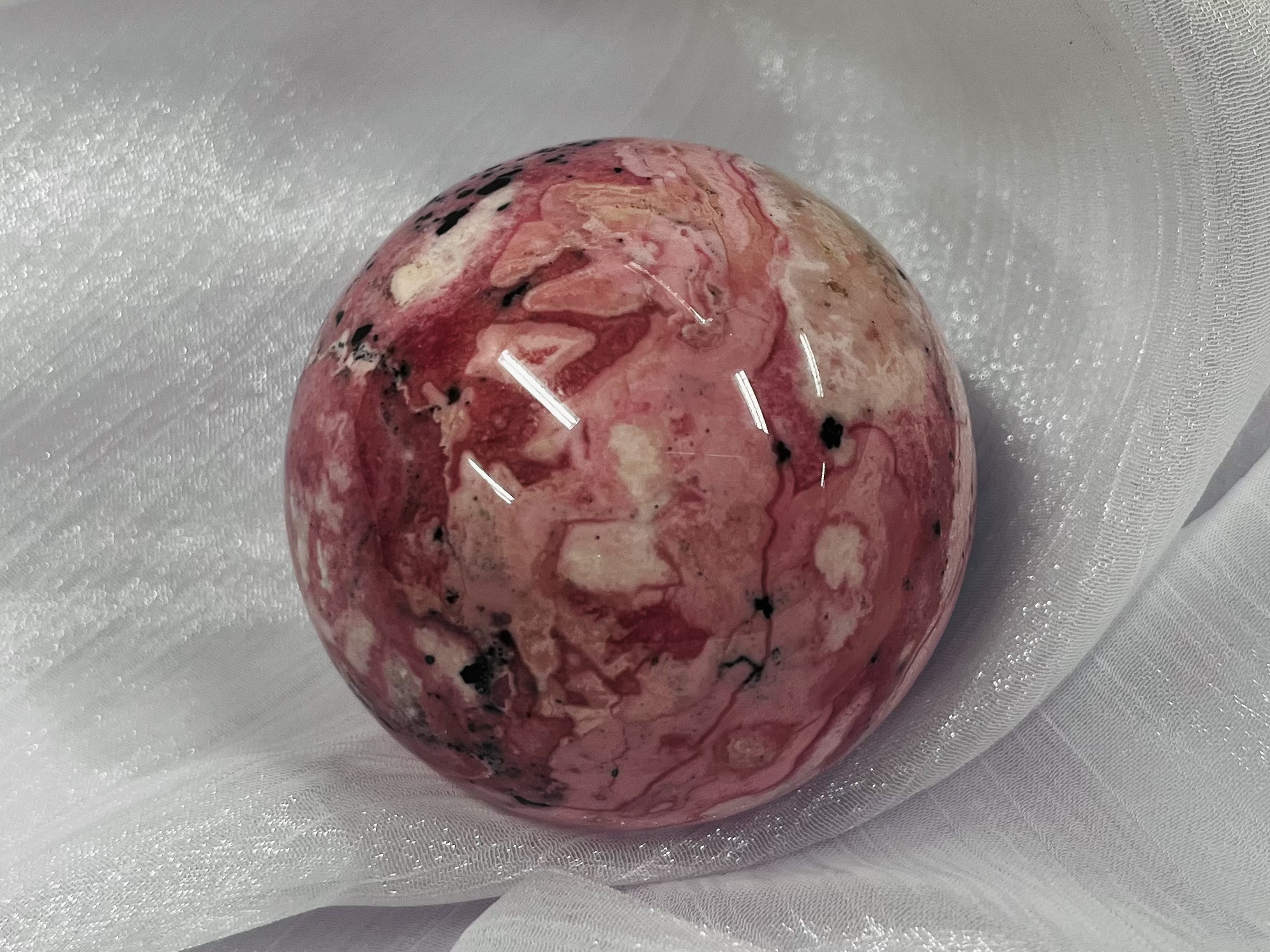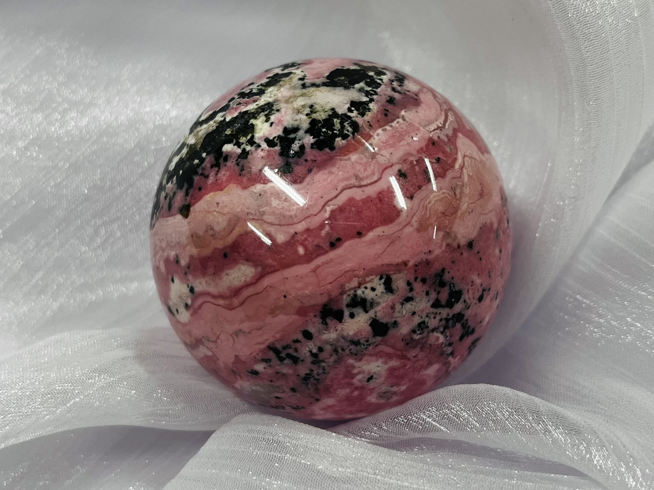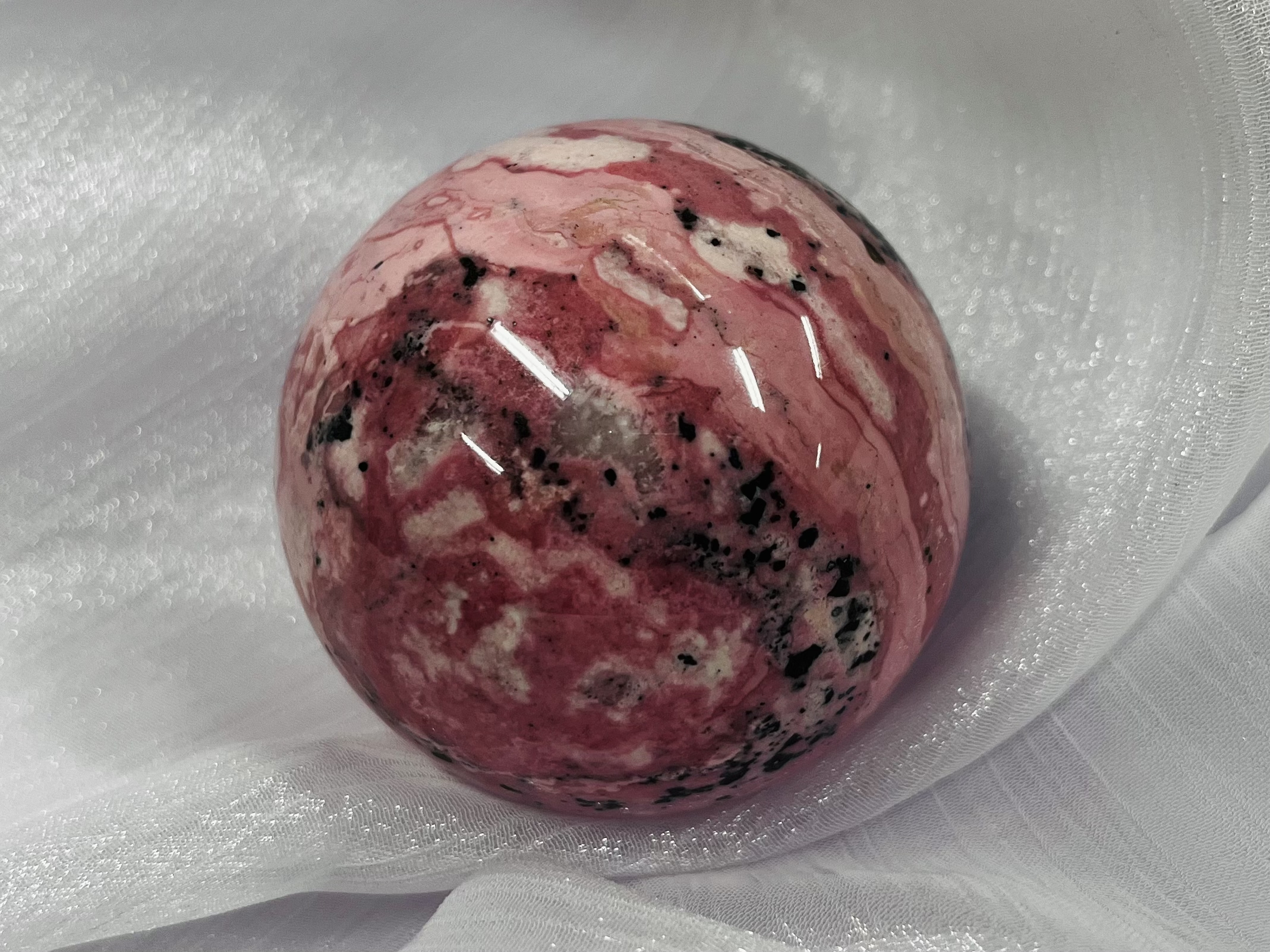 秘魯紅紋石(Rhodochrosite)外形為亮麗的粉紅色到草莓色,帶有獨特白色或乳白色渦旋狀條紋,是著名的『愛情之石』,主要功效圍繞心輪的療癒與愛的流動,能招正桃花、增進人緣、療癒情傷、提升自信與行動力,並帶來好心情和身體健康,促進內在的愛與自我價值。