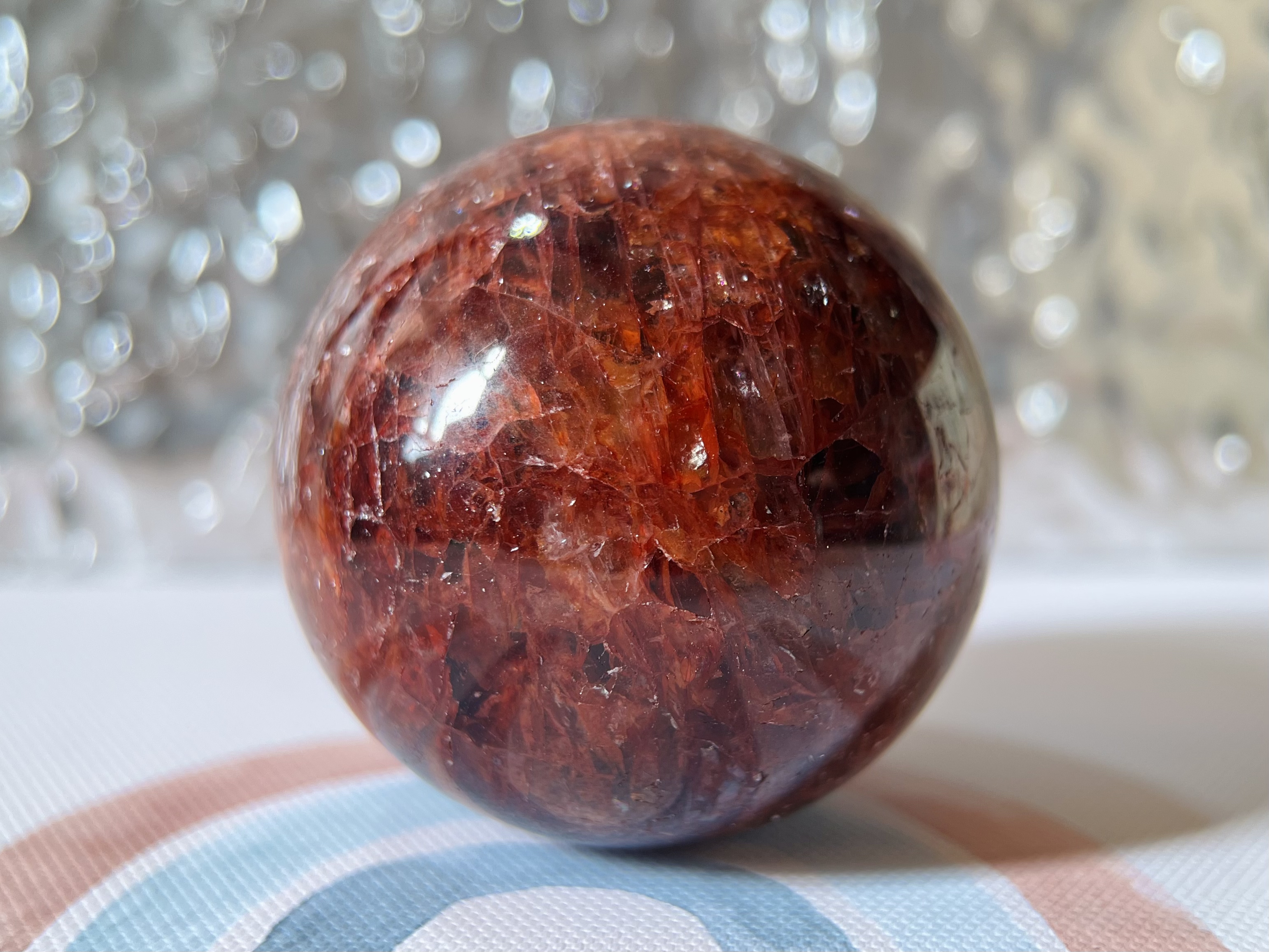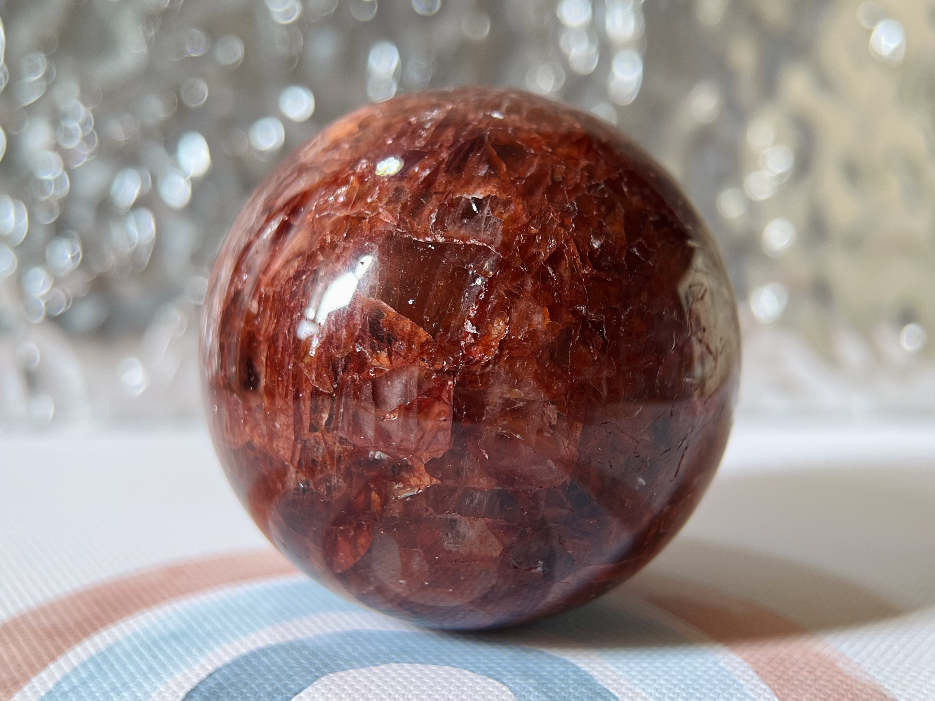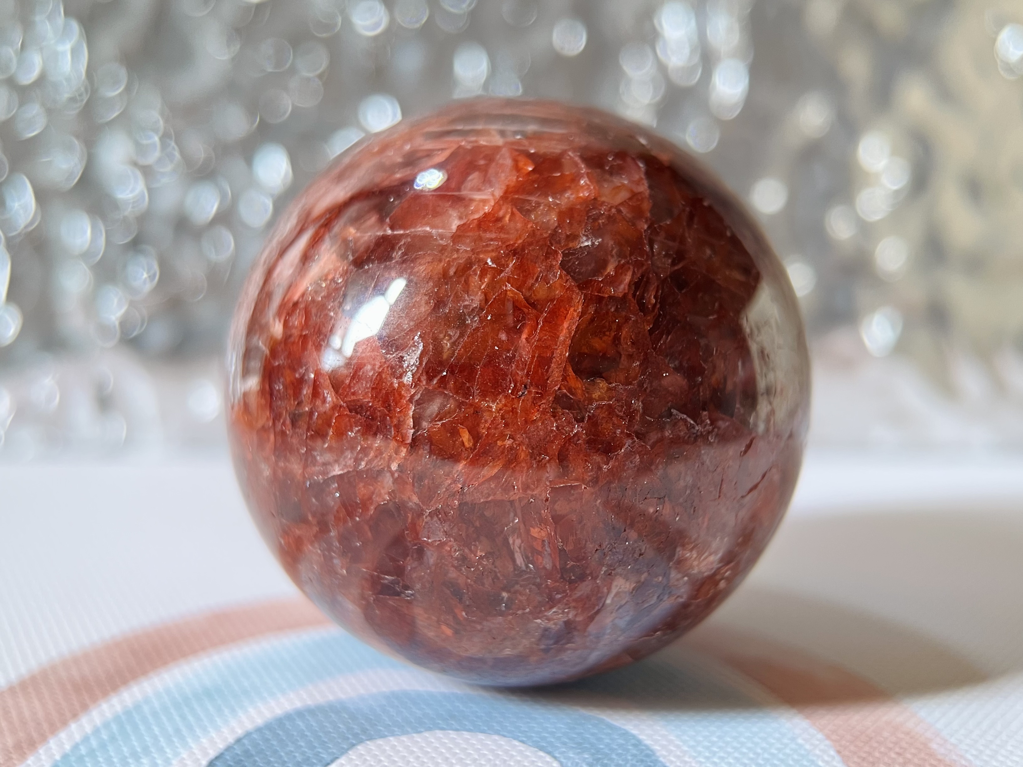 紅膠花石球(Fire Quartz/Hematoid Quartz)是白水晶內含赤鐵礦形成,外觀呈現紅色或橙紅色的雲霧狀或花瓣狀內含物,形似綻放的花朵,能量溫暖且強力,主要功效包含提升活力與行動力、增強自信與決策力、招正財與貴人緣,並能平衡身心、療癒情感、淨化負能量,同時對招桃花與人緣也有幫助。