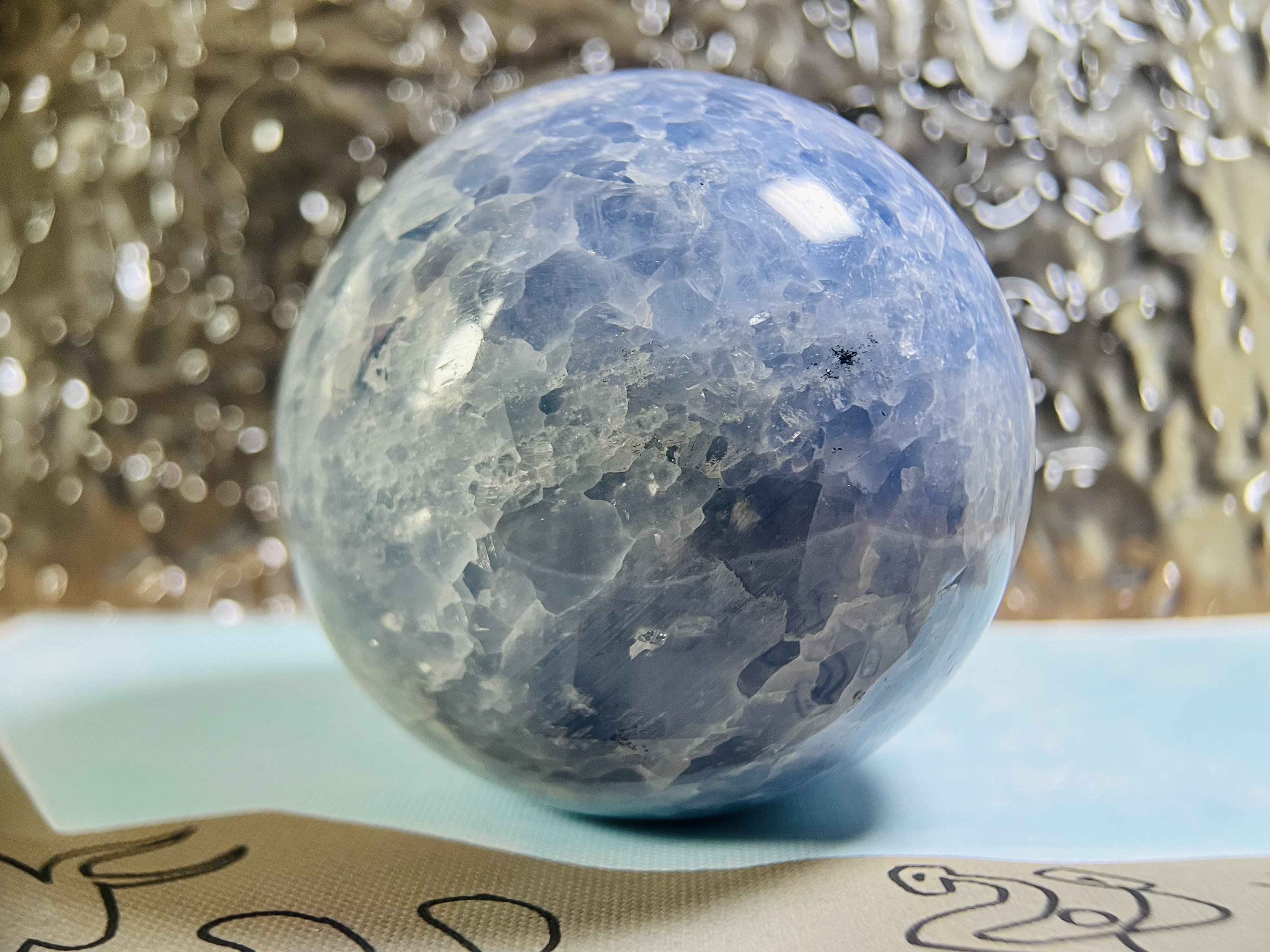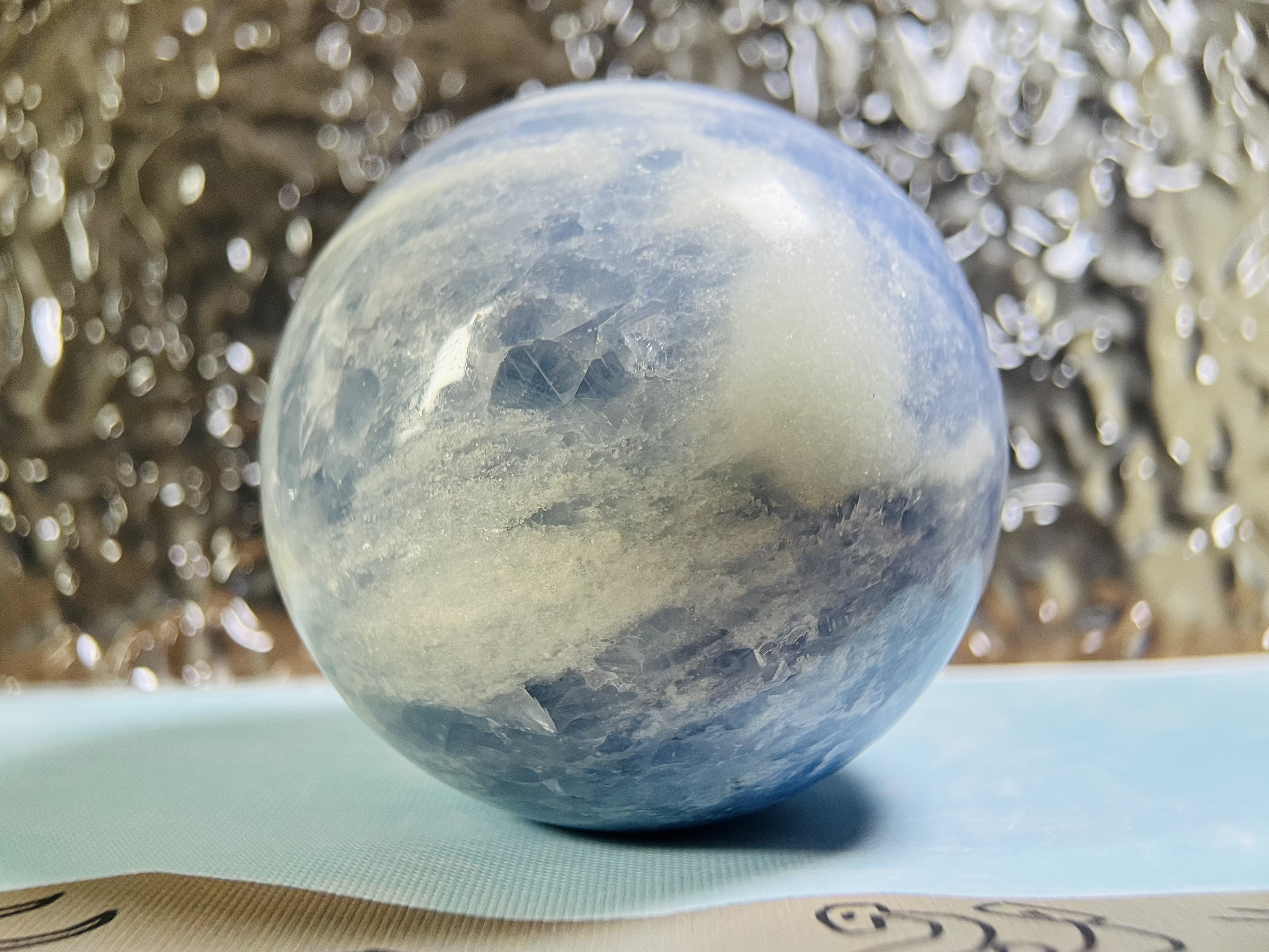 天青石球外形呈夢幻的淺藍色,有玻璃光澤,質地極易碎、怕水,常被視為連接靈性、帶來平靜的天使水晶。它主要功效在於安撫情緒、舒緩壓力,助於冥想和溝通,淨化負能量,適合放在臥室或辦公桌以平衡身心、提升直覺和人際關係。