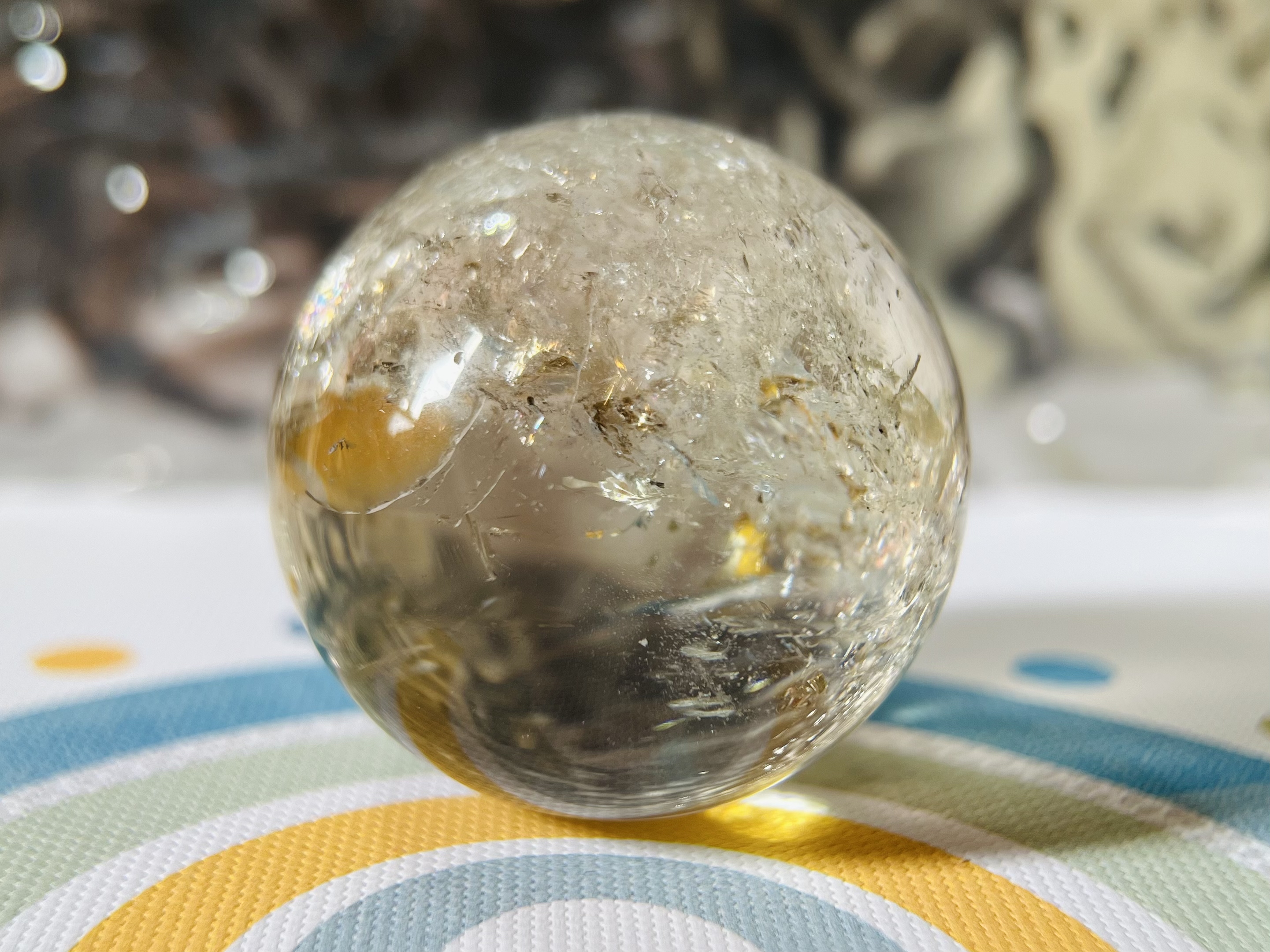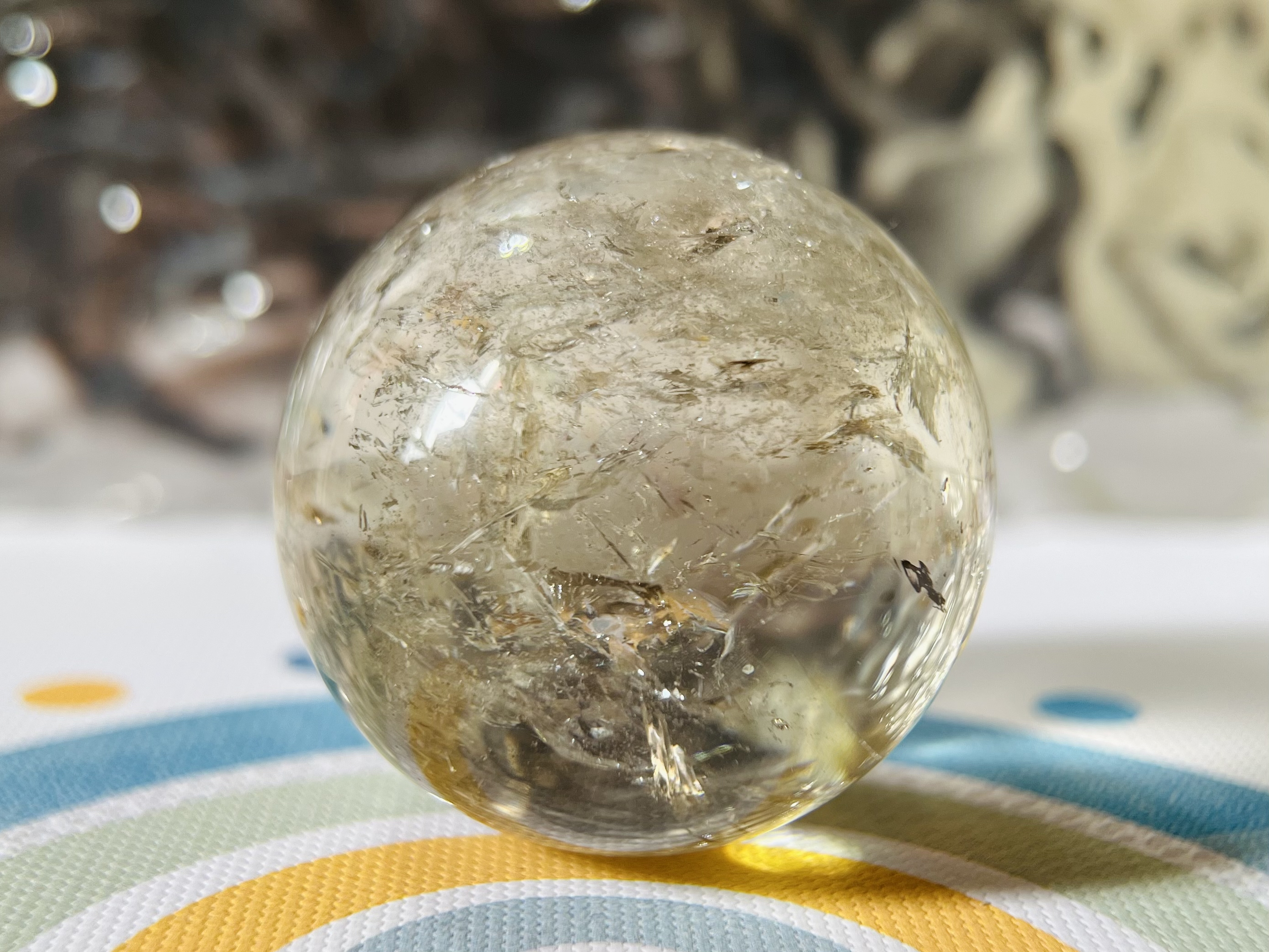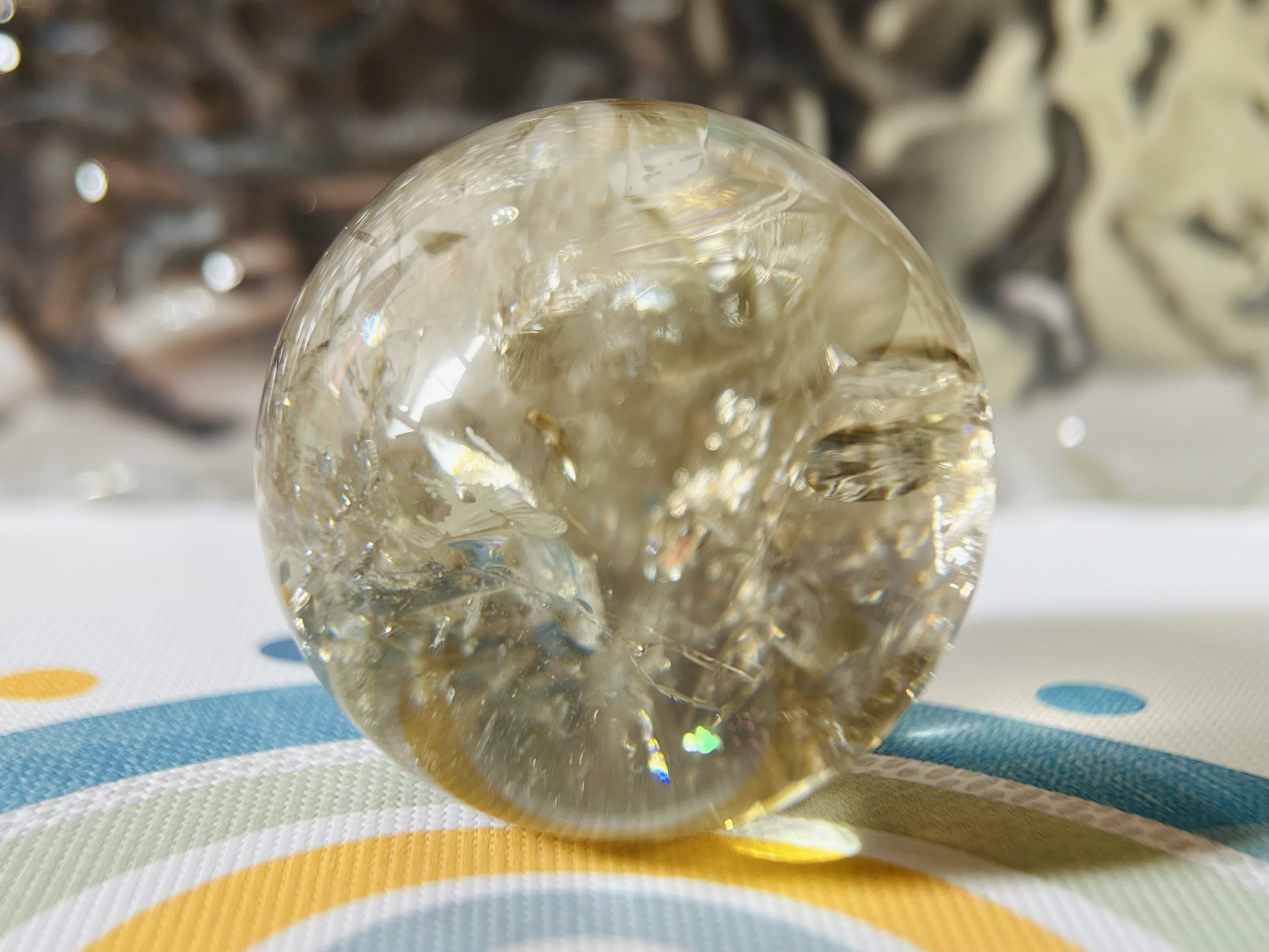 茶晶球(Smoky Quartz)是一種深沉的茶色水晶,色澤由淺棕到深黑,有「煙水晶」之稱;其功效主要在於穩定心神、吸收負能量、舒緩壓力、提升接地感,幫助改善睡眠,並被視為「情緒排毒師」,適合需要安定、排解負面情緒及增強耐力的人,對應海底輪,有助於身心健康與穩財。