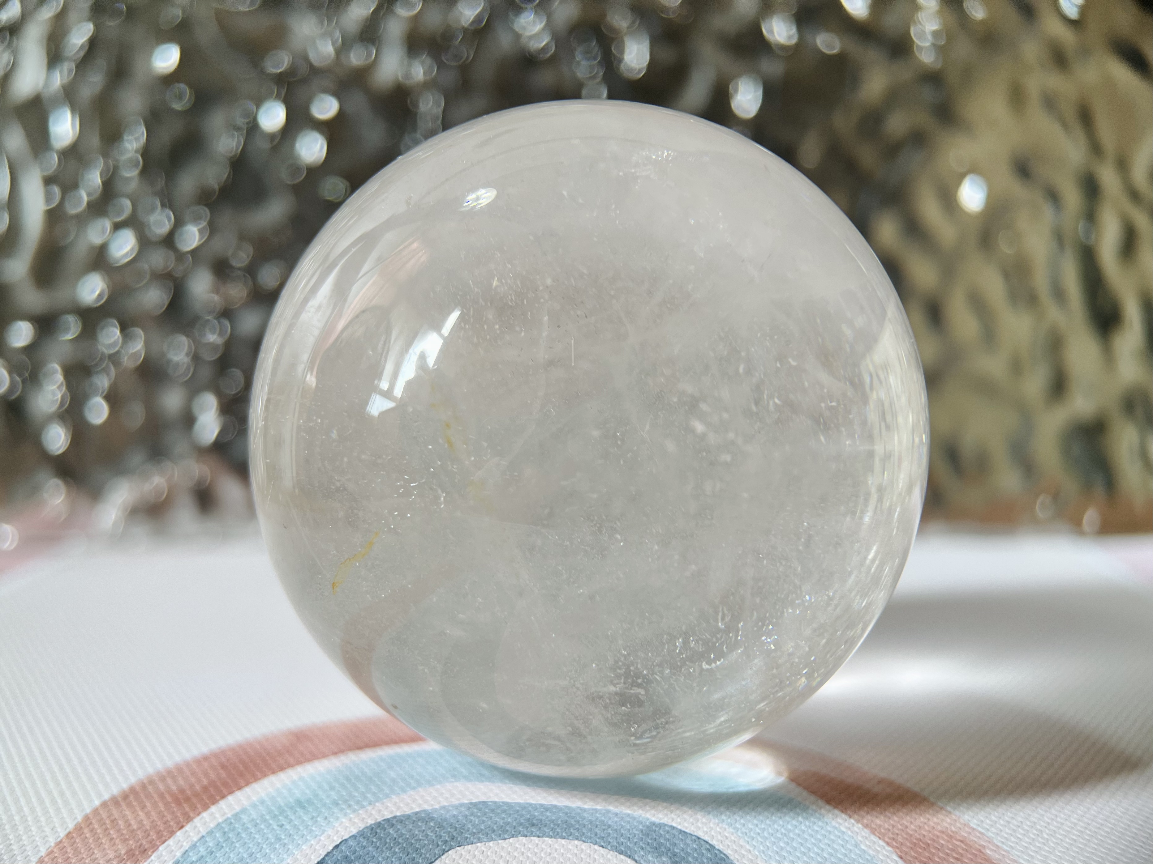 白水晶球是由透明至半透明的六角柱狀晶體研磨而成,外形純淨,常有冰裂或彩虹光,被譽為「水晶之王」,能淨化負能量、提升精神與專注力、平衡身心,並聚集正能量、避邪擋煞,適合用於風水擺設(如客廳角落、書桌)或冥想,有助事業、健康與靈性成長。