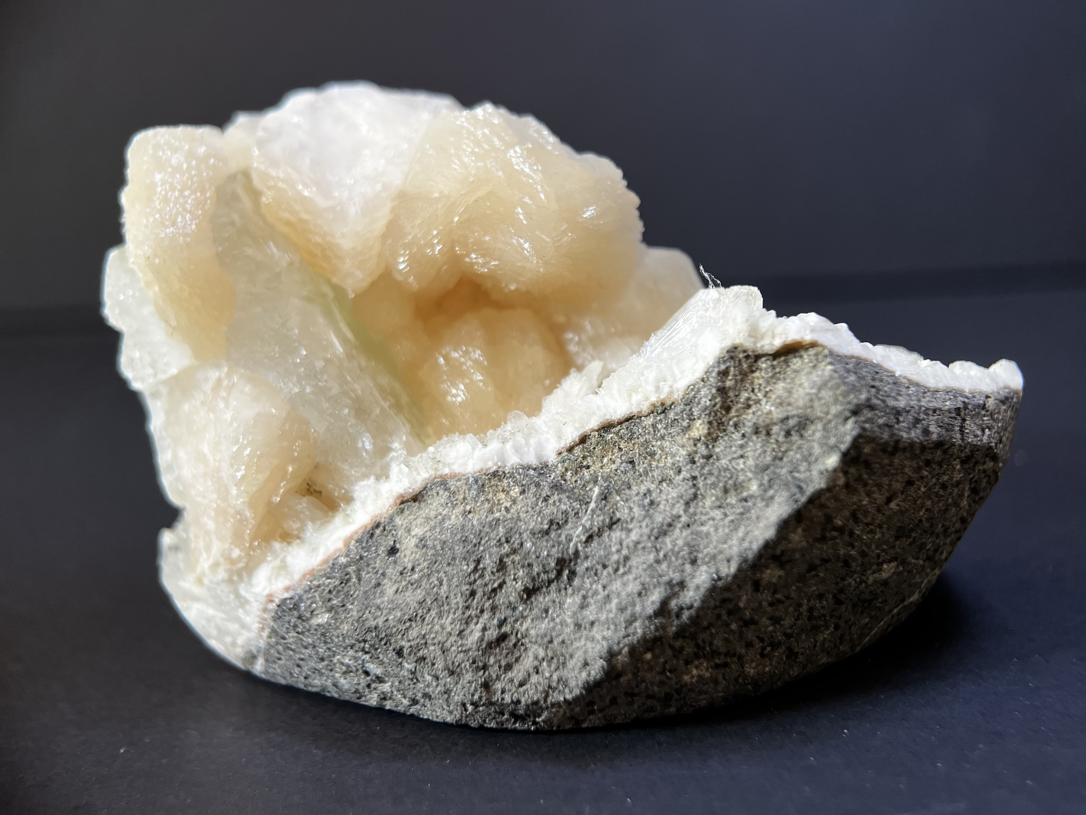 顏色:最常見為白色,亦有淡綠、淡藍、淡粉紅、淡灰等,常與沸石、方解石等共生。